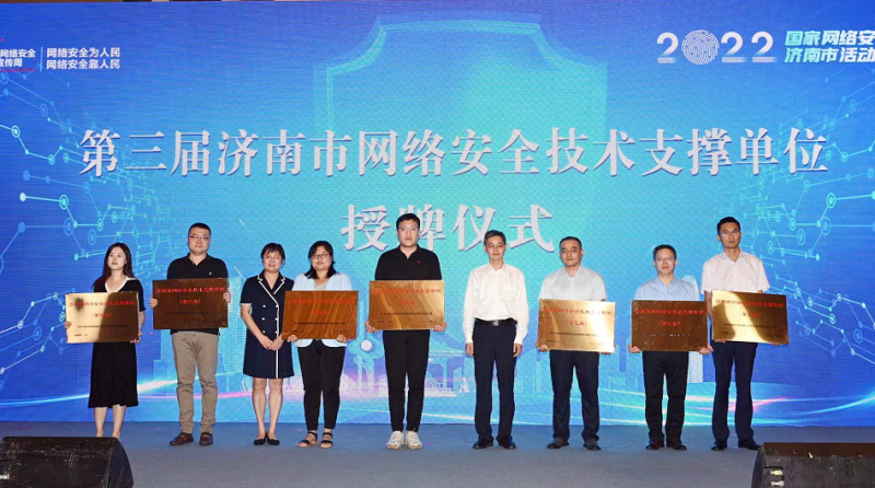 网络安全,你我共建。维护网络安全是全社会的共同责任,需要广大网民共同参与。为充分发挥人民群众的力量和智慧,打通网络安全宣传的“最后一公里”,济南市委网信办前期召开了一系列的评优选优活动,与当天一并举行了颁奖授牌仪式。其中包括济南市网络安全宣传志愿者代表颁发聘书、第三届济南市网络安全应急技术专家颁发聘书、济南市网络安全技术支撑单位授牌等。918博天堂软件经过前期的活动报名,现场答辩,最终入围了第三届济南市网络安全技术支撑单位称号。