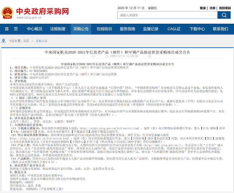 2020年12月10日,中央国家机关政府采购中心正式发布了中央国家机关2020-2021年信息类产品(硬件)和空调产品协议供货采购项目成交公告,本...